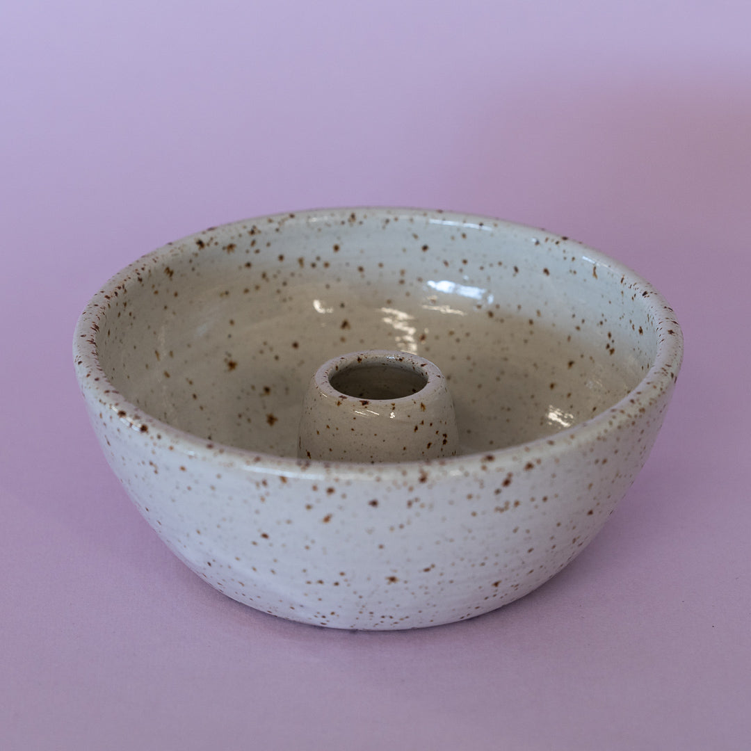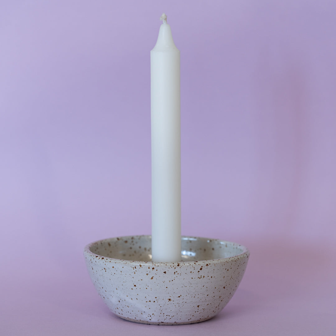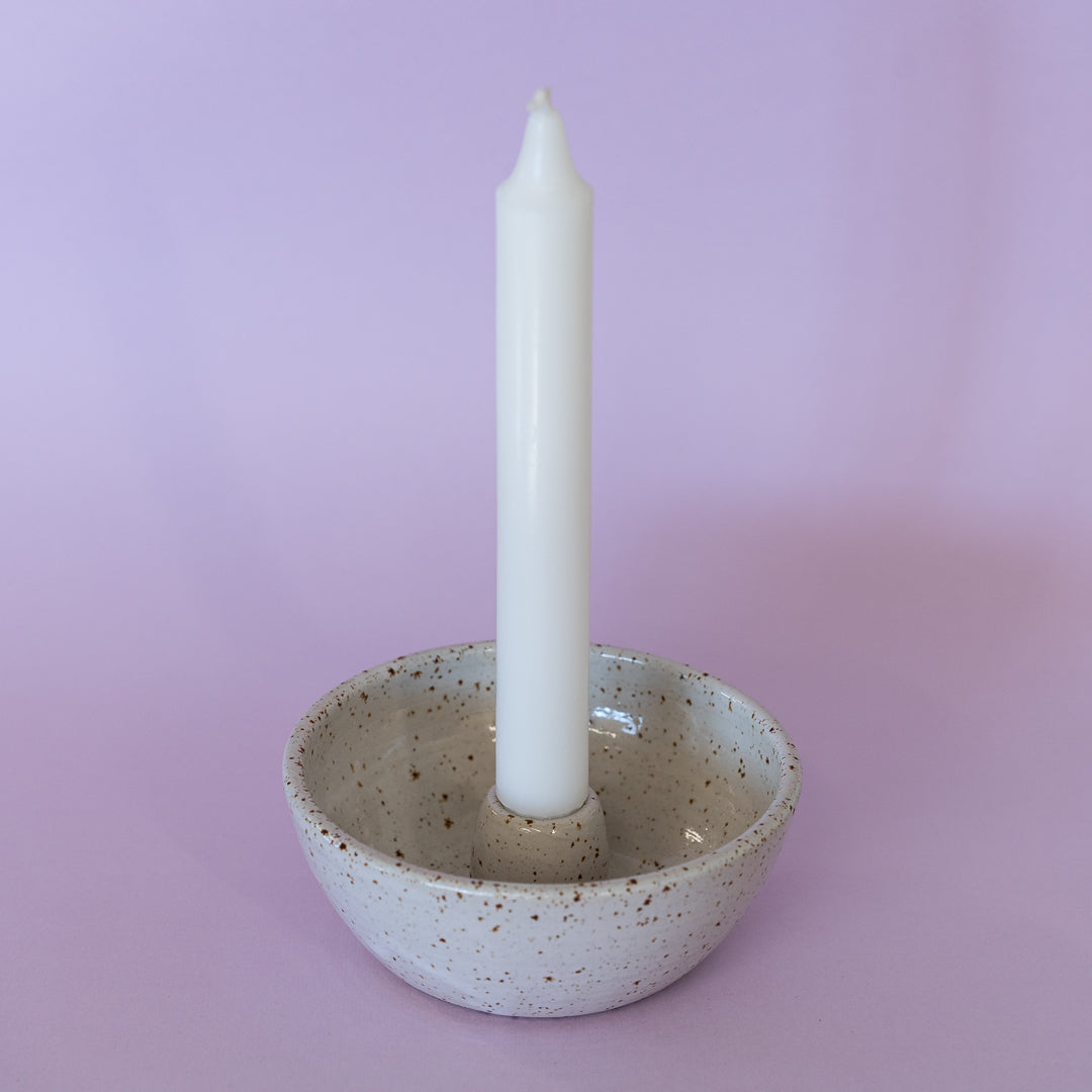 Pilkkusaven ja valkoisen lasitteen kaunis liitto! Sinulle, joka haluat hillityn kynttilänjalan, johon ruskeat pilkut kuitenkin tuovat lisäilmettä ja lämpöistä sävyä.