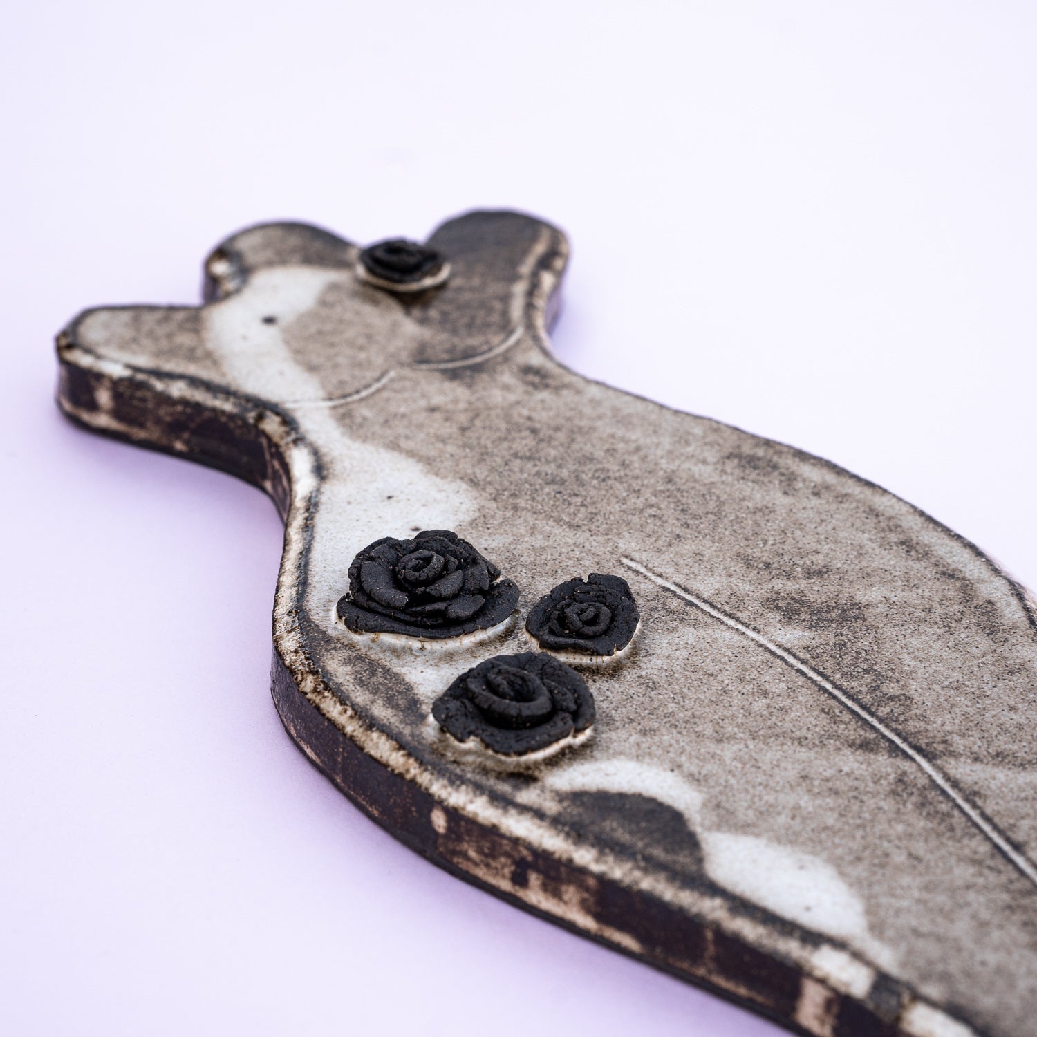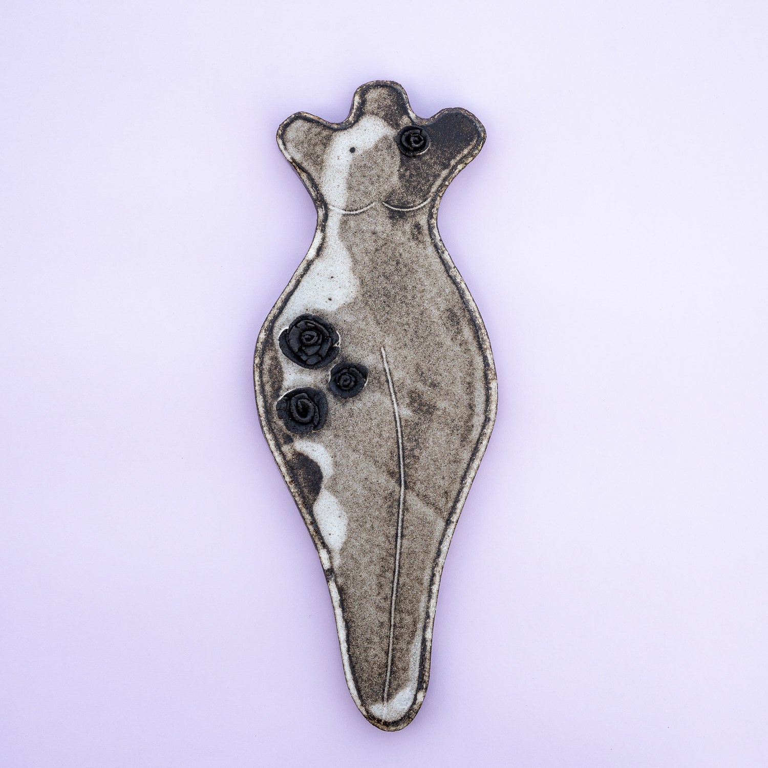 Keramiikkaveistos. Kivitavara, lasite. Signeerattu. Takana rautalankalenkki ripustusta varten. ~K34 cm.